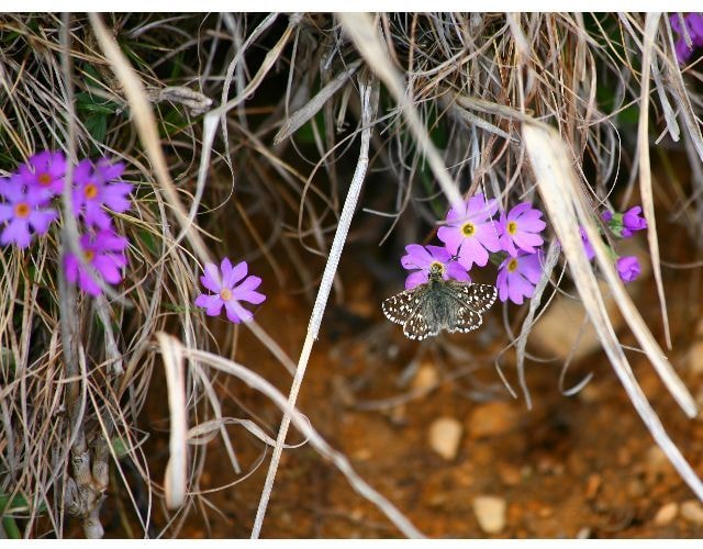 サマニユキワリで吸蜜するヒメチャマダラセセリ