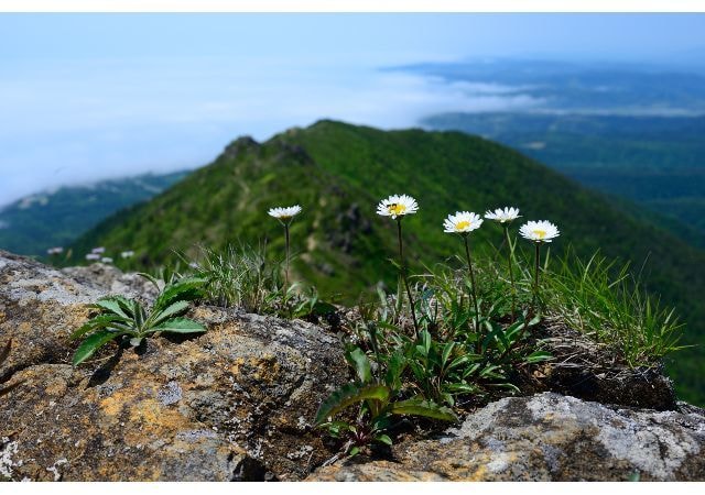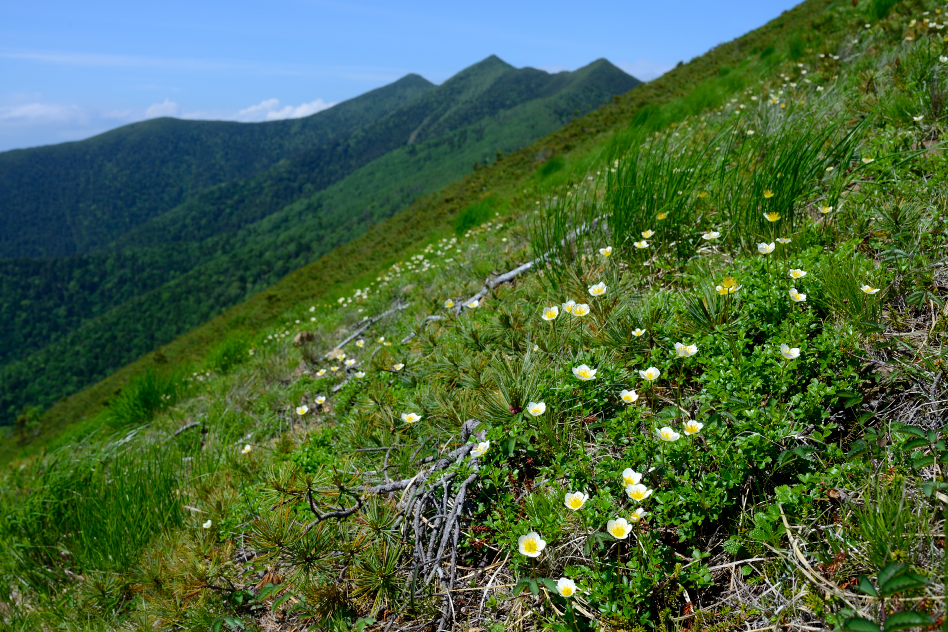 吉田岳からピンネシリまでの斜面に咲くチングルマ