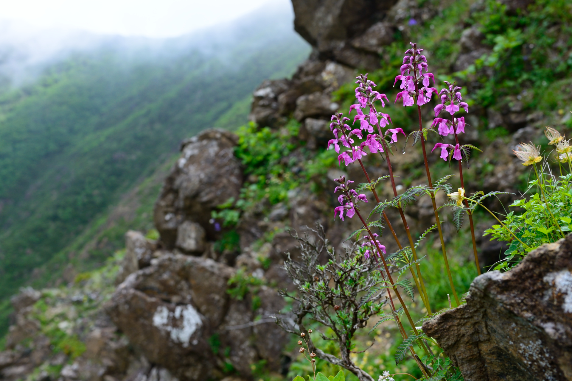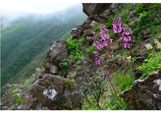 霧のなかでキタヨツバシオガマの紅が映えていた