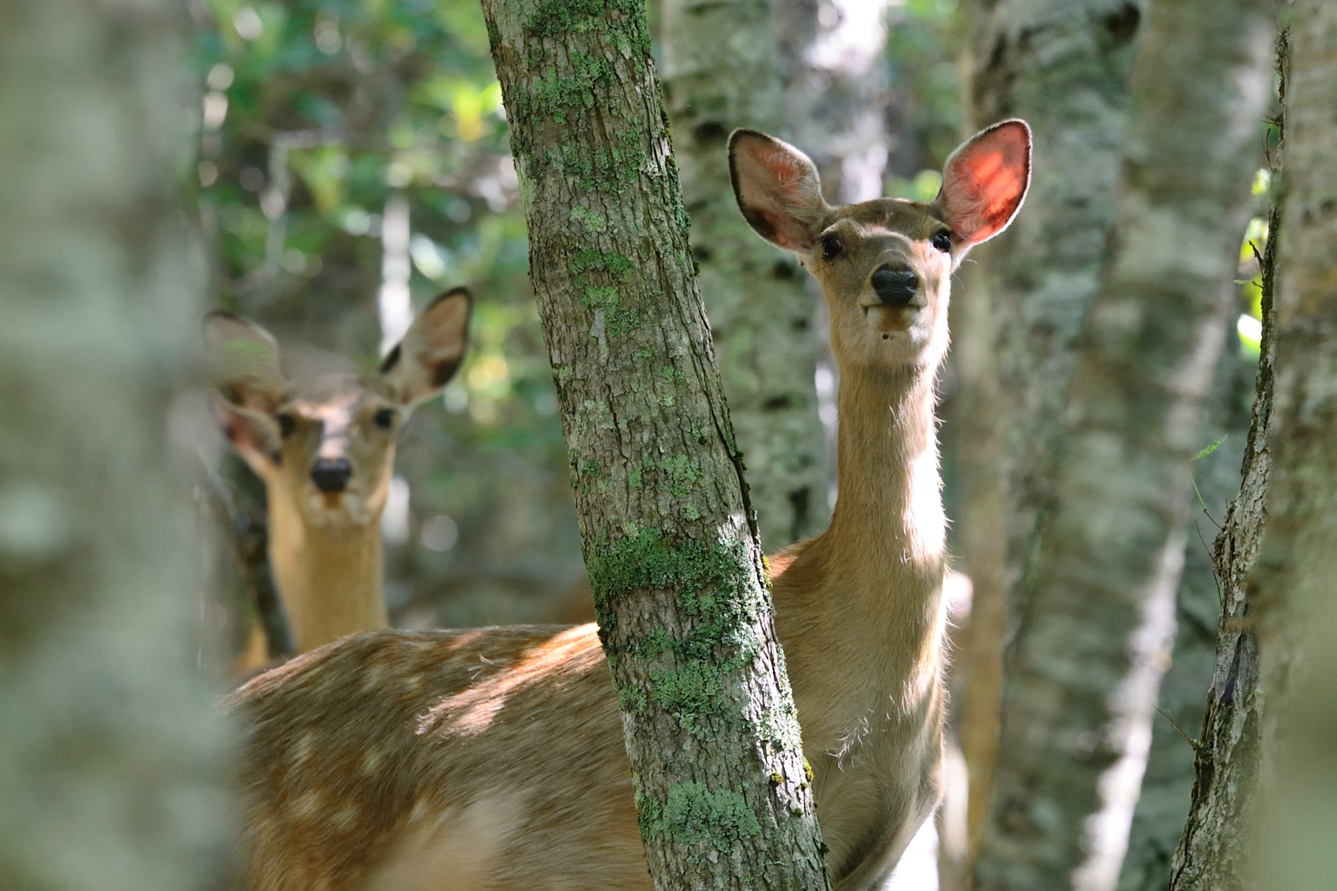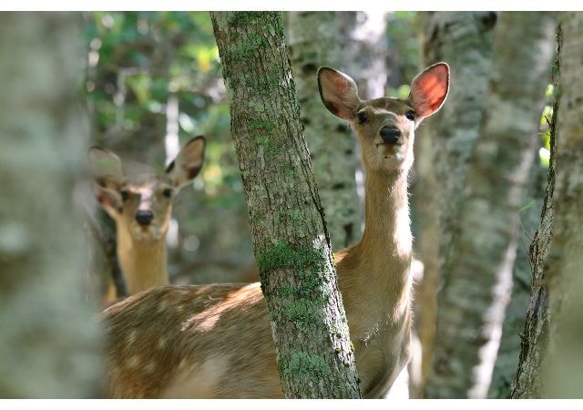樹林帯では木々の間からエゾシカがこちらを見ていた